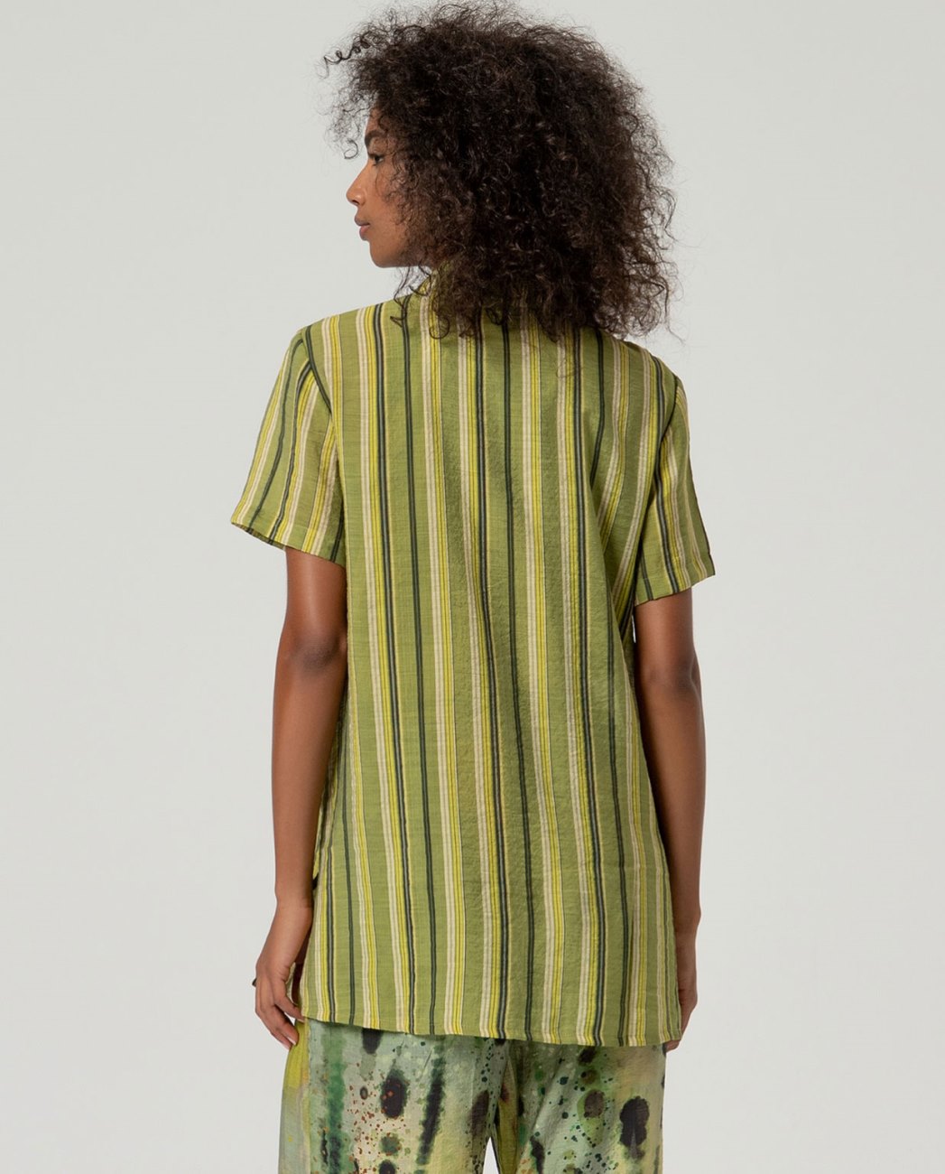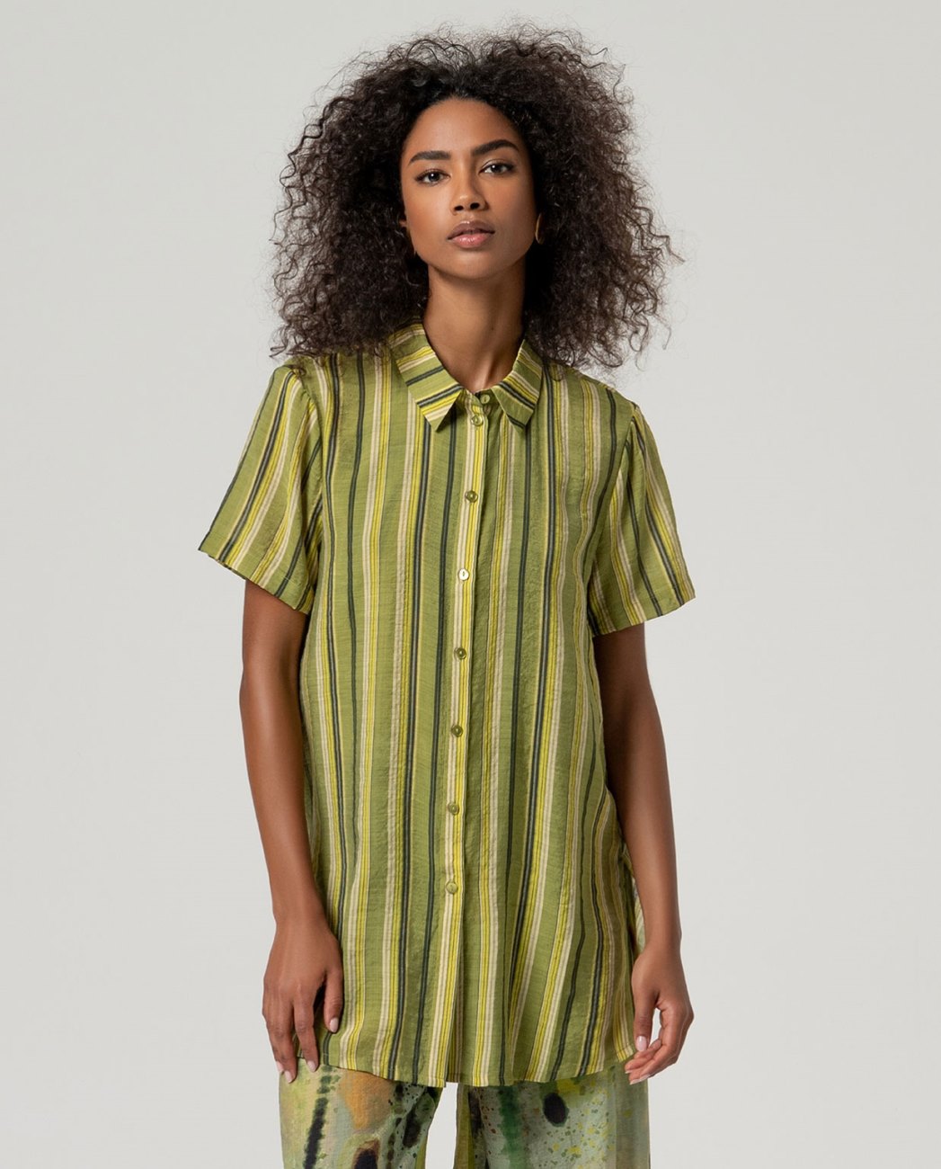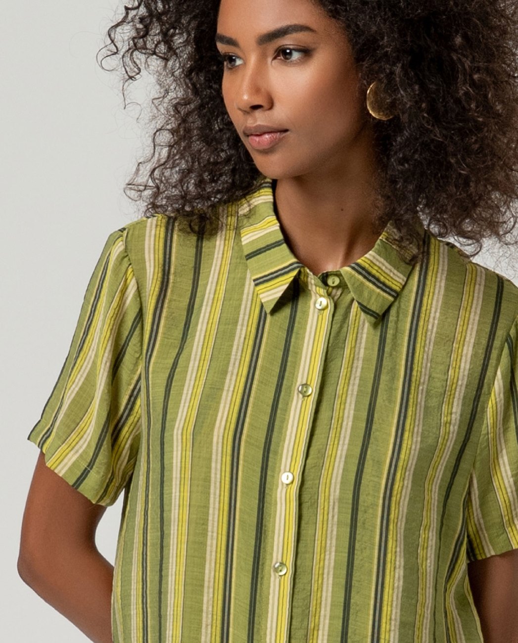 camisa de mangas curtas. Design de silhueta reta com fechamento de botão frontal e estampado de listras verticais.