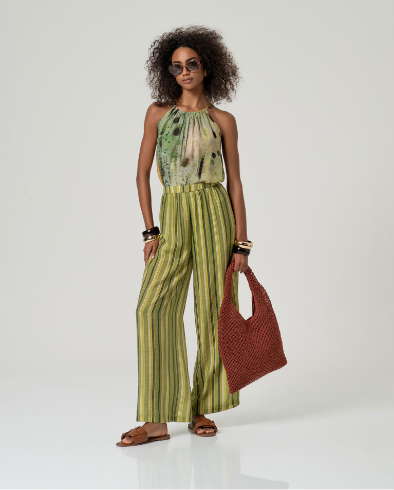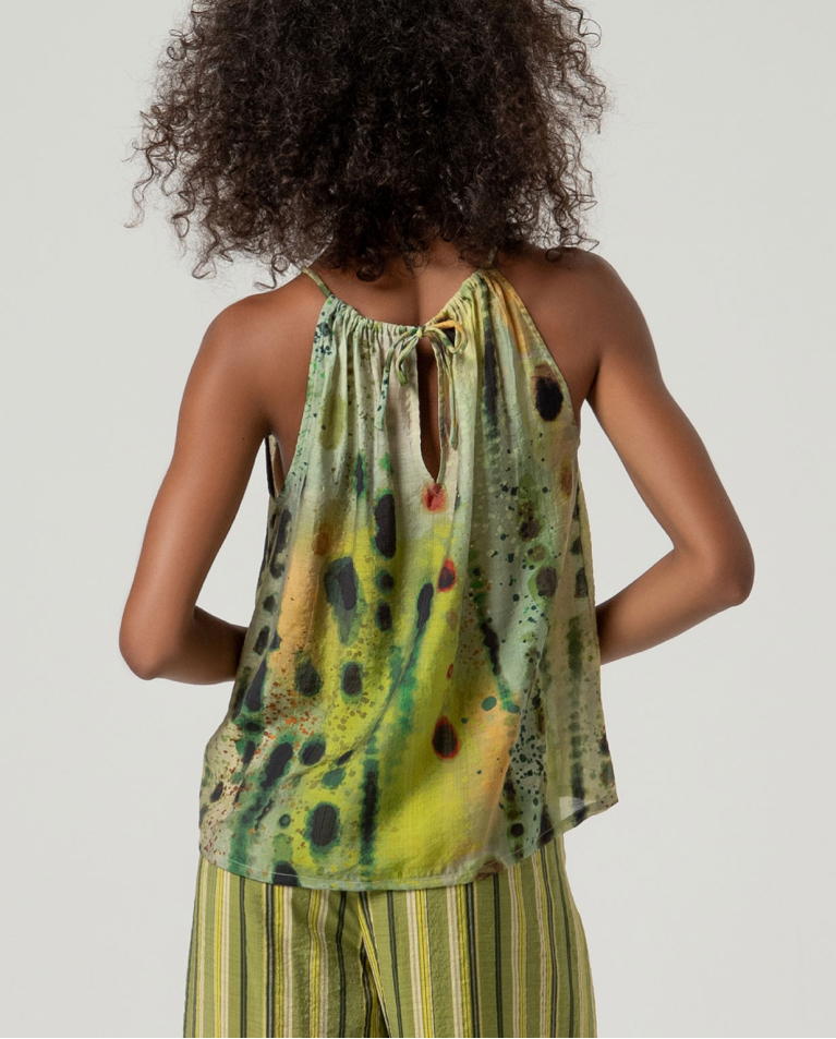 top com decote halter. Design sem mangas com decote franzido e gravata na parte de trás do pescoço. Atrás com abertura central e corte reto.